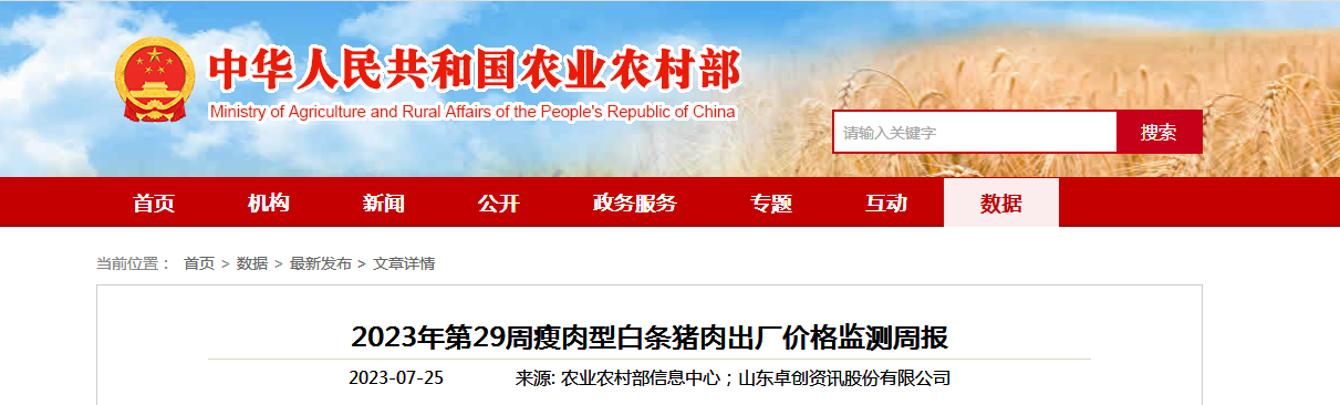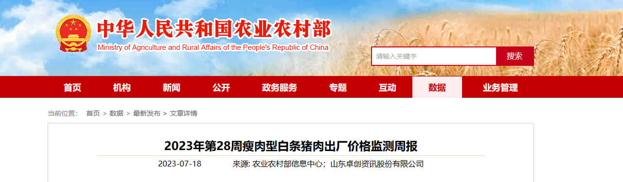 據(jù)農(nóng)業(yè)農(nóng)村部信息中心和山東卓創(chuàng)資訊股份有限公司聯(lián)合監(jiān)測,2023年第29周(即2023年7月17日-7月21日,以下簡稱本周),16省(直轄市)瘦肉型白條豬肉出廠價格總指數(shù)的周平均值為每公斤18....