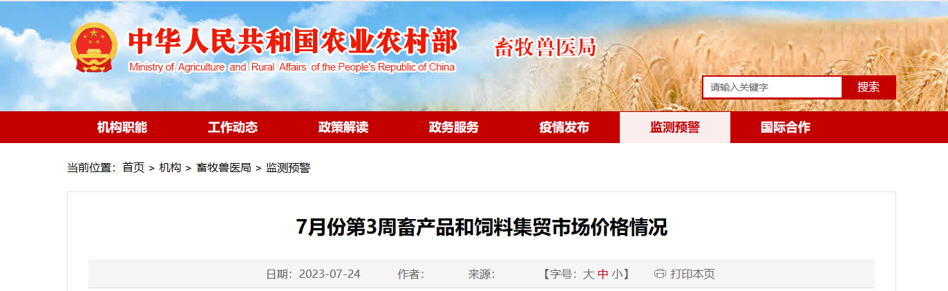 據(jù)對全國500個縣集貿(mào)市場和采集點的監(jiān)測,7月份第3周(采集日為7月19日)生豬、家禽產(chǎn)品、飼料價格上漲,仔豬、牛羊產(chǎn)品價格下跌,豬肉價格持平。生豬產(chǎn)品價格。全國仔豬平均價格31.43元/公斤,比前一...